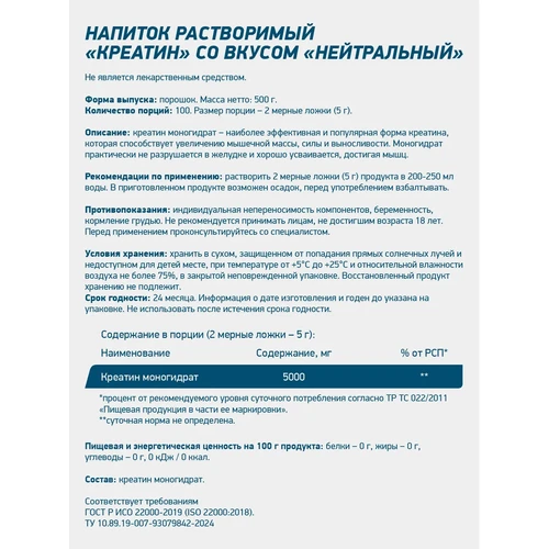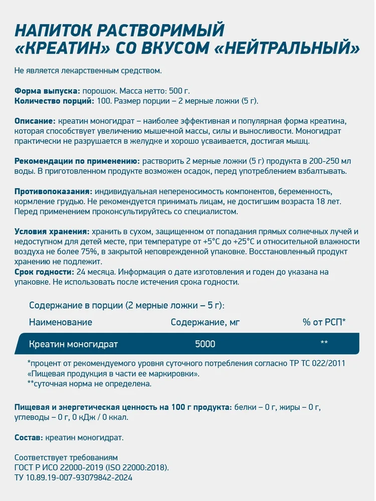 Активное вещество: 5000 мг (5 г) креатина моногидрата.