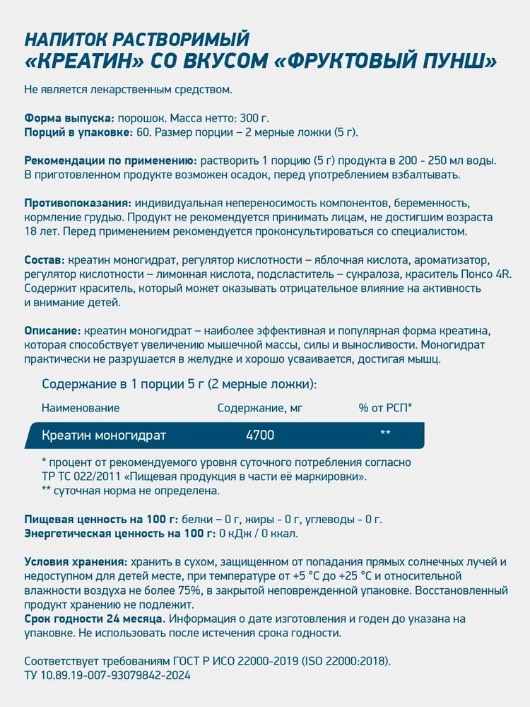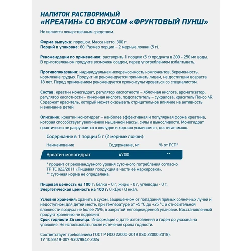 Приятный Вкус: Вкус «Фруктовый пунш» маскирует естественный привкус креатина, превращая прием добавки в приятный ритуал без дискомфорта.