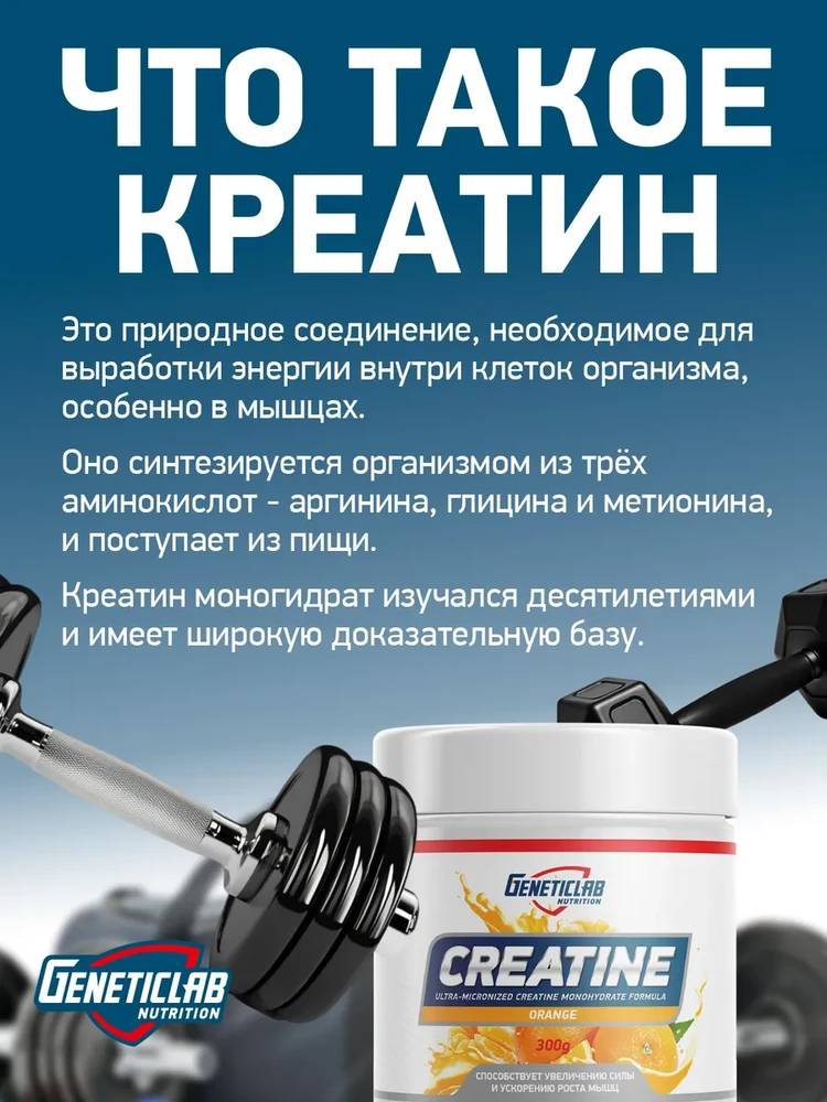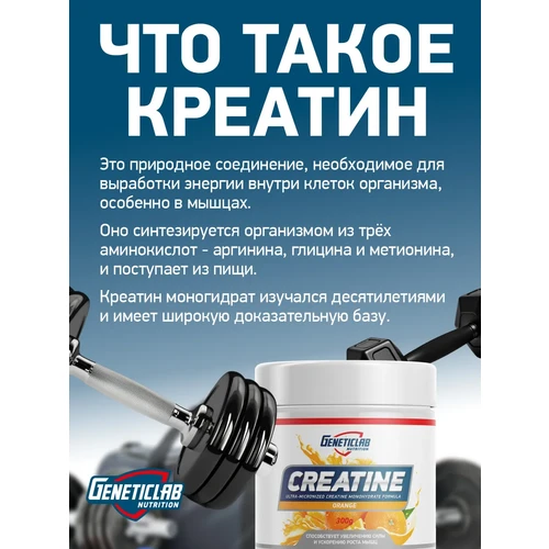 Креатин моногидрат — это самая эффективная и популярная добавка в спортивном питании, чья эффективность многократно доказана исследованиями. Продукт от Geneticlab Nutrition обеспечивает чистый креатин в удобной и приятной форме со вкусом спелого апельсина.