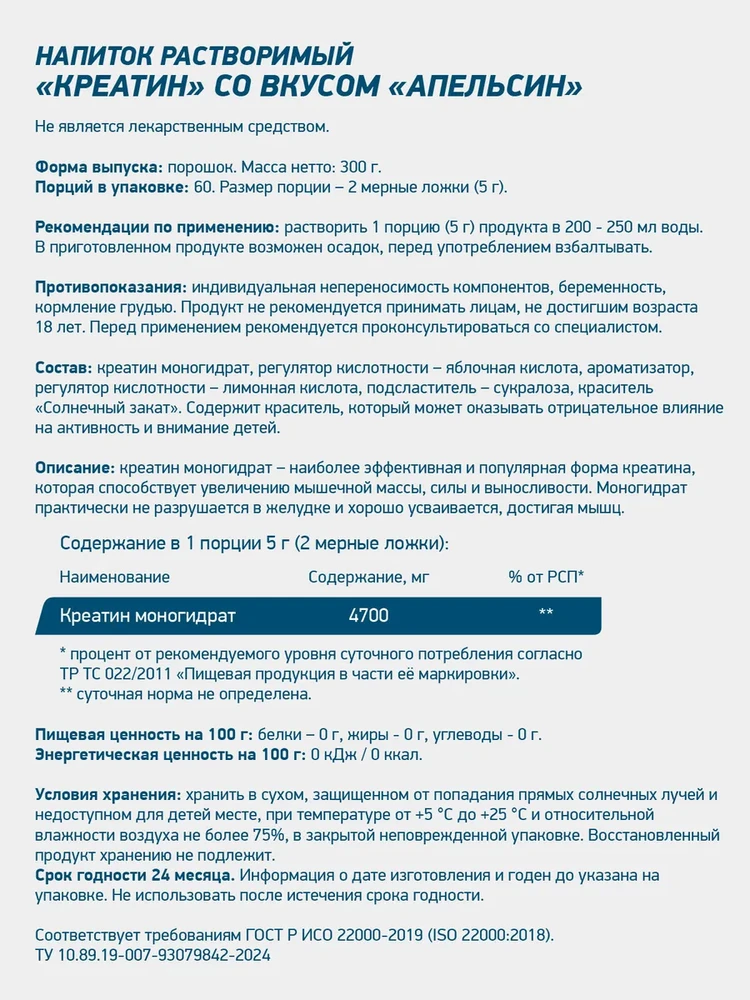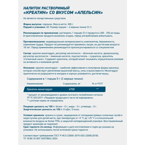 Состав (на 1 порцию 5 г): Активное вещество: ~4.7 г креатина моногидрата.Вспомогательные компоненты: Ароматизатор натуральный «Апельсин», регуляторы кислотности (лимонная кислота), подсластитель (сукралоза), краситель.
