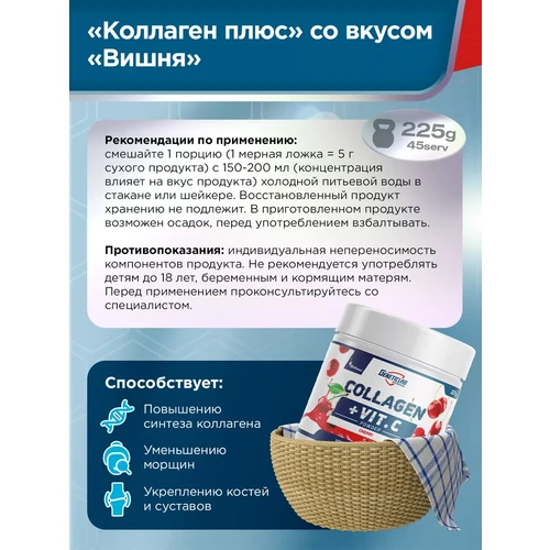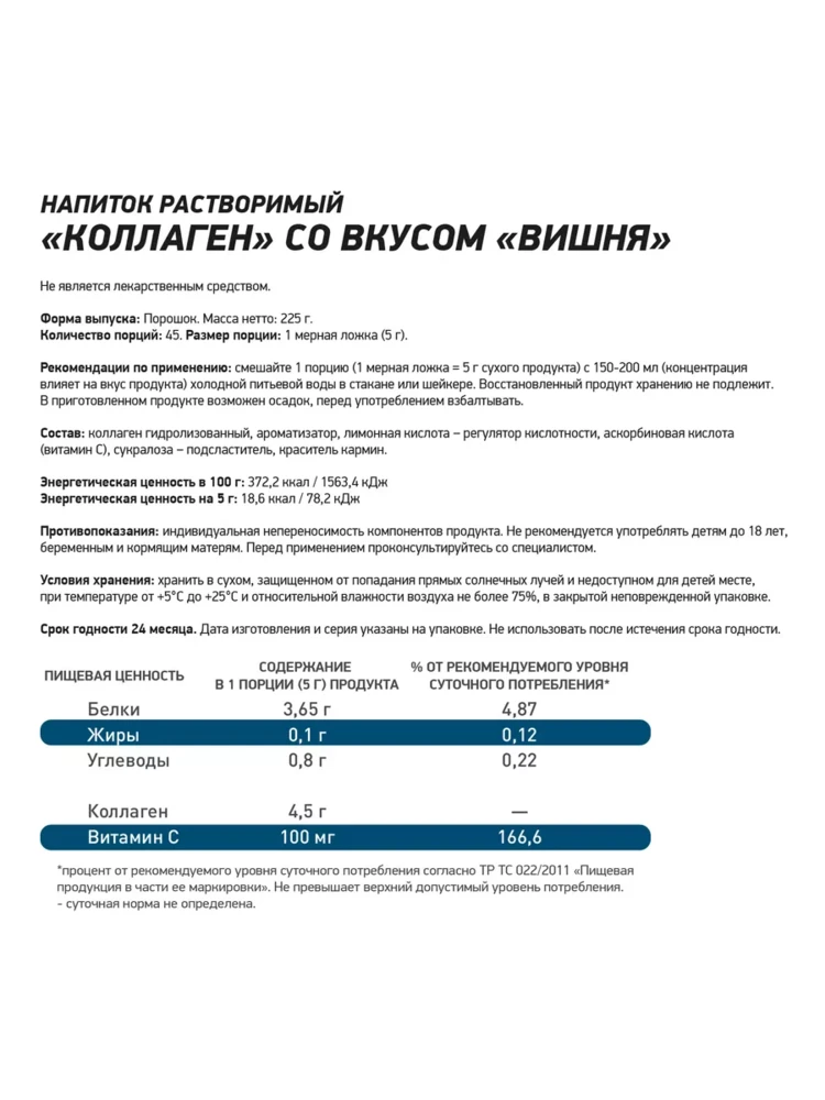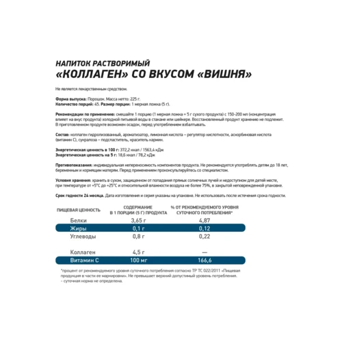Основные ингредиенты:Коллаген гидролизованный: 4,86 г на порцию 5 г (по данным shop-atlet.ru).