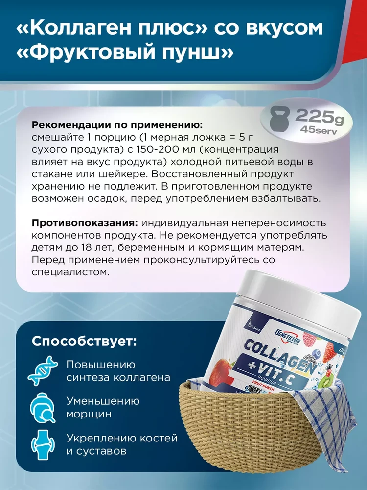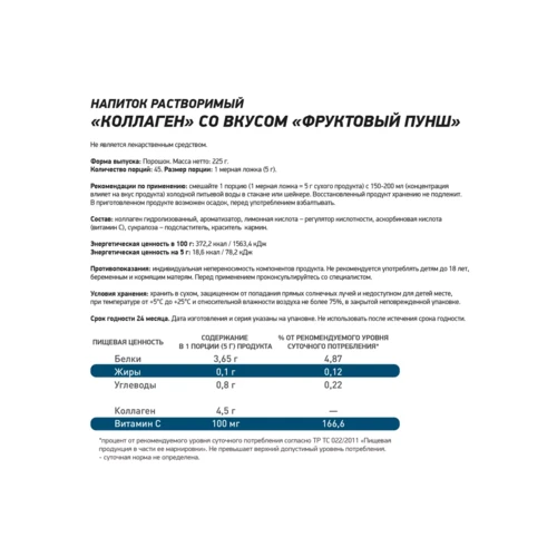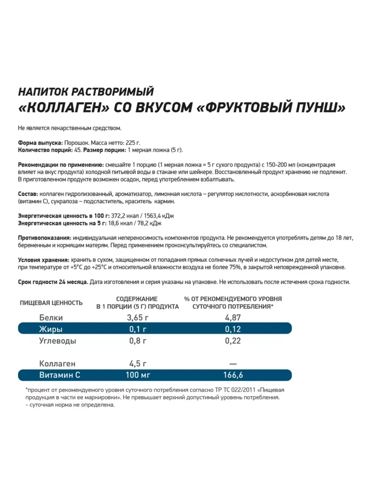 Основные ингредиенты:Коллаген гидролизованный.Аскорбиновая кислота (витамин С).