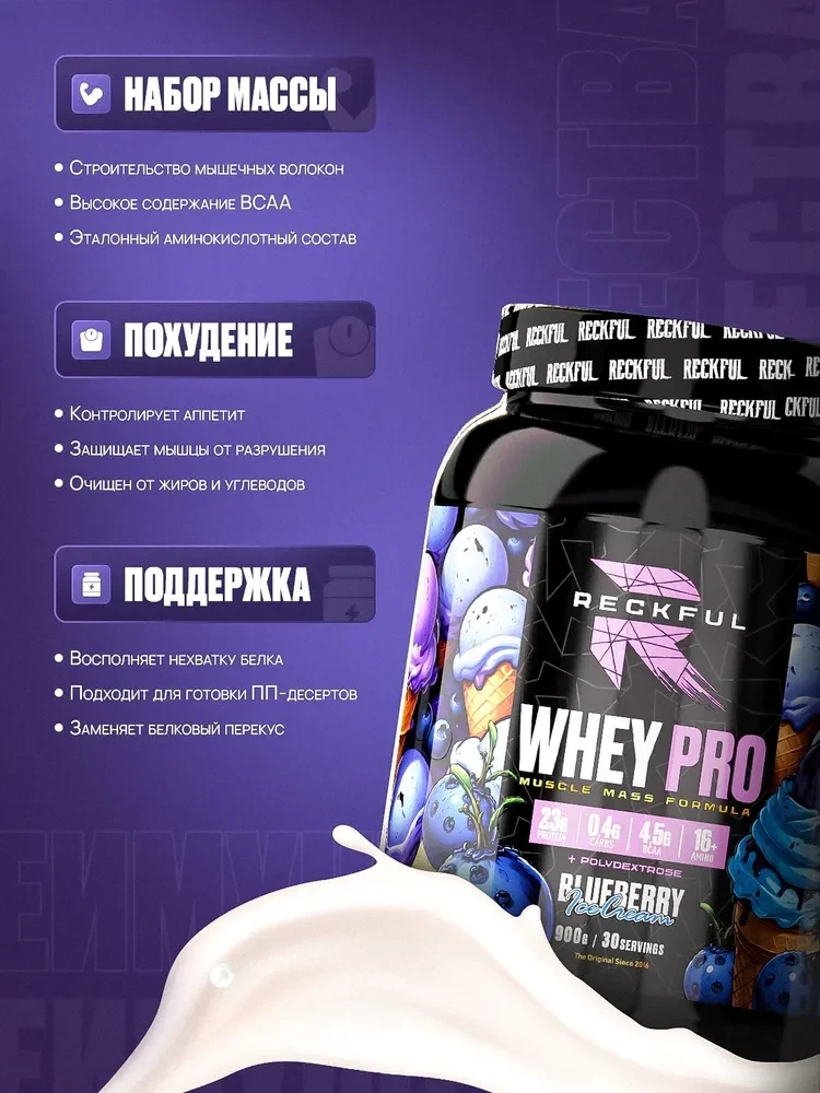 Reckful Whey ProОтличный вариант высокобелкового коктейля, подходящий как для поддержки, увеличения, набора веса и мышечной массы, так и для улучшения восстановления после интенсивных тренировок. Каждая порция продукта содержит 23 гр концентрата белка с полноценным аминокислотным составом (включая BCAA), поэтому данный спортивный протеин удовлетворит все нужды организма в белке как у мужчин, так и у девушек.