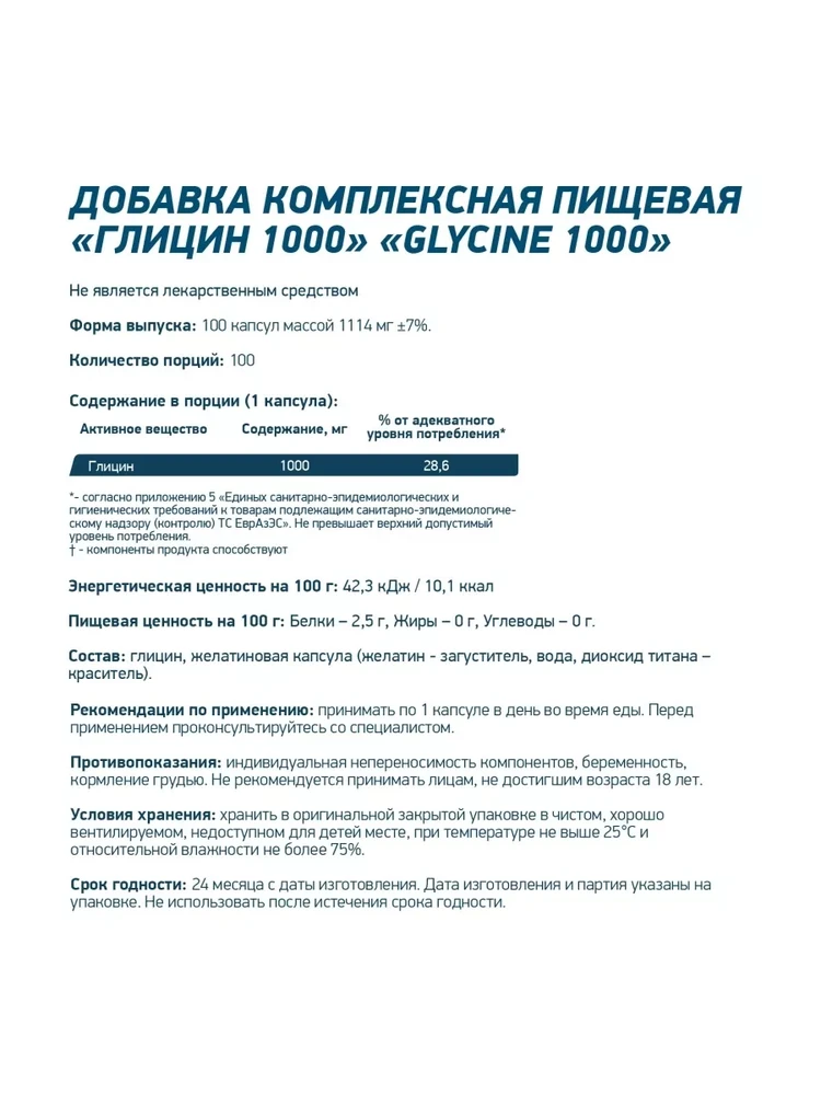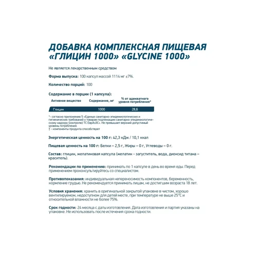 Активные компоненты (в 1 капсуле): Глицин: от 500 мг до 1000 мг (зависит от конкретной фасовки бренда).