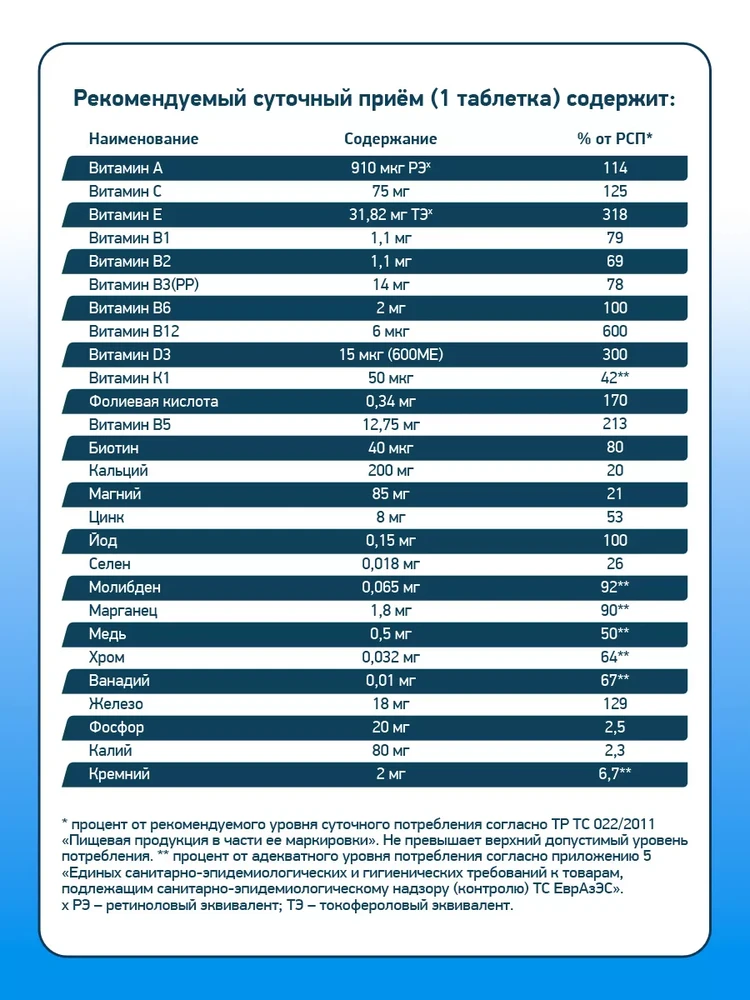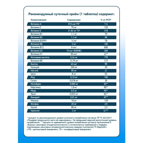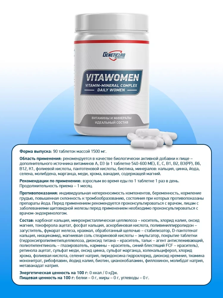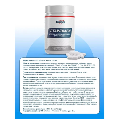 Рекомендации по применению: Взрослым женщинам следует принимать по 1 таблетке один раз в день во время приема пищи.