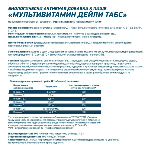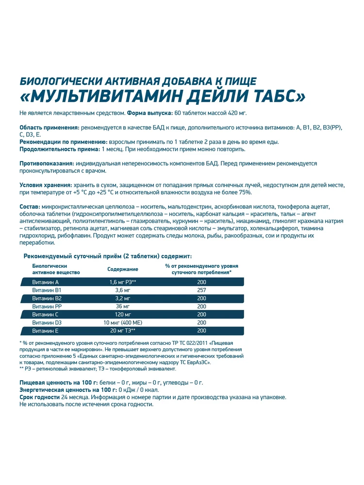 В состав комплекса входят 12 витаминов и 5 минералов, необходимых для полноценного функционирования организма. Содержание в суточной дозировке (2 таблетки)Витамин А1,6 мг