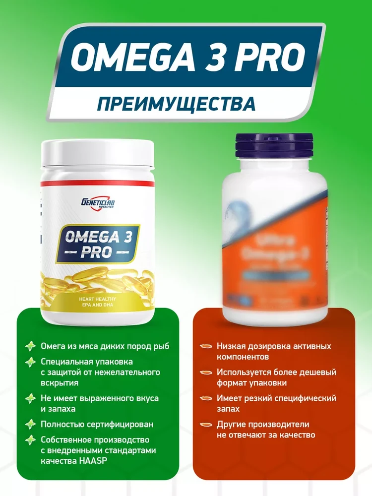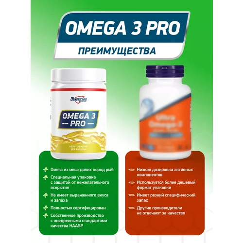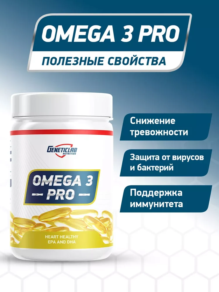 Продукт Geneticlab Nutrition Omega 3 Pro (также встречается под названием Omega PRO 3 1000 мг) — это комплексный препарат, обогащенный витамином Е.