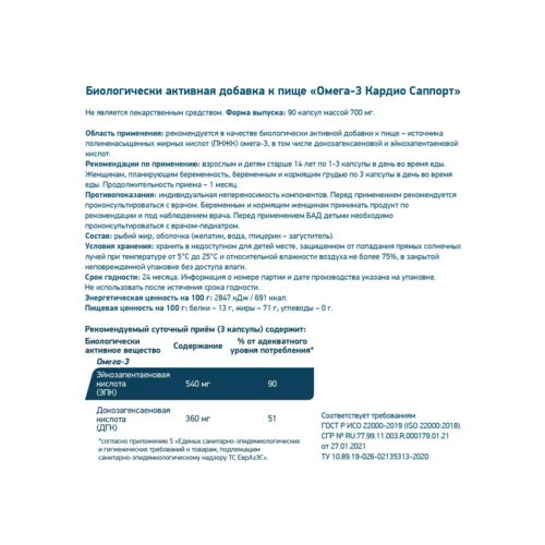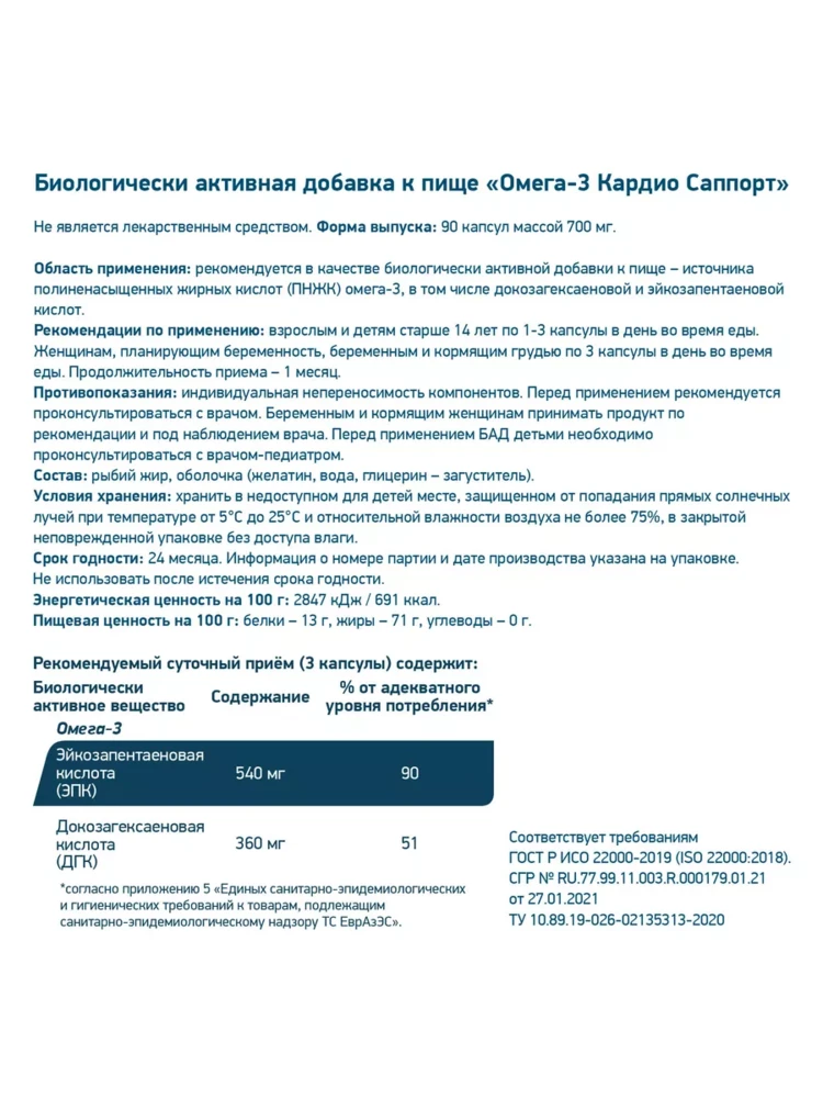 Содержание на 1 порцию (обычно 1 капсула массой 700 мг или 1000 мг в зависимости от фасовки):Общие ПНЖК Омега-3: около 350 мг.