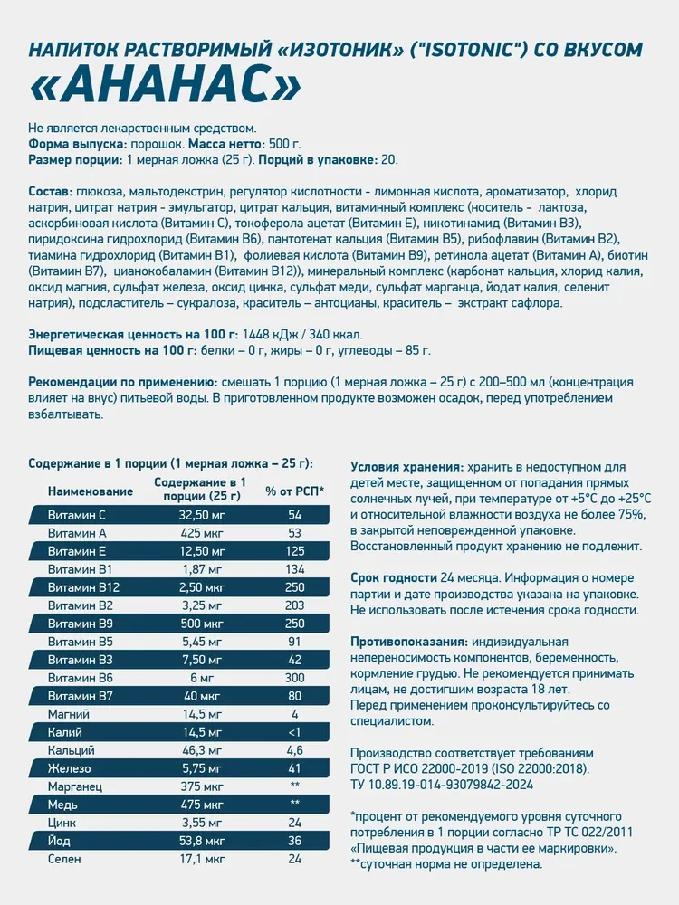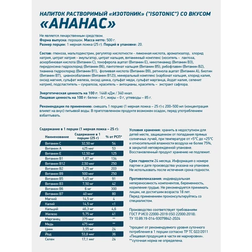 Основные компоненты: Декстроза, мальтодекстрин, цитрат натрия, хлорид калия, лактат кальция, цитрат магния, витаминный комплекс (C, B-группа, E).