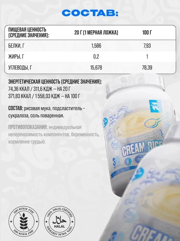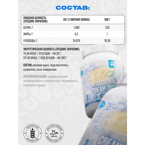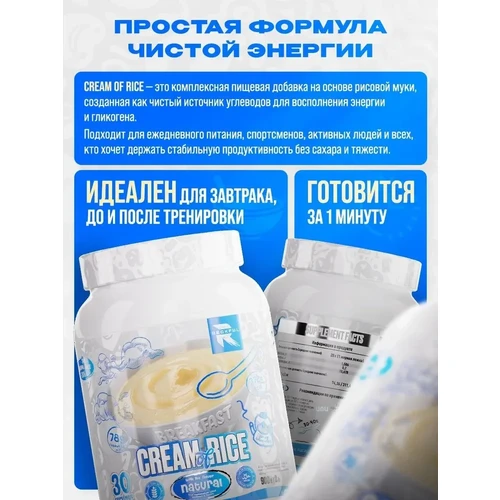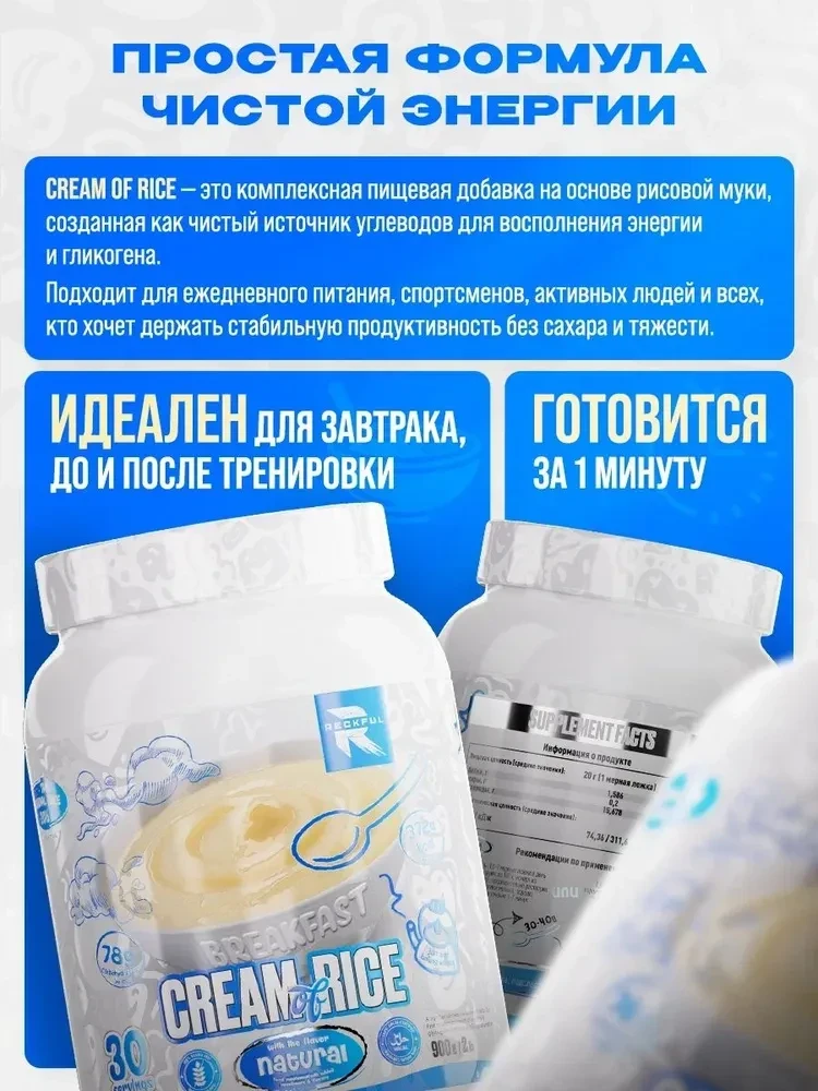 Cream of Rice Reckful (Крим оф Райс) — это спортивный рисовый крем в порошке, который служит удобным источником быстрых и “чистых” углеводов. Продукт делают из переработанного риса, поэтому он легко переваривается, не перегружает желудок и подходит даже тем, у кого чувствительное пищеварение. Крим оф райс часто используют как натуральный гейнер: он помогает увеличить калорийность рациона без лишнего сахара и тяжёлых смесей, а ещё отлично сочетается с протеином, ореховой пастой, фруктами или добавками.