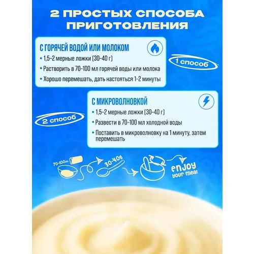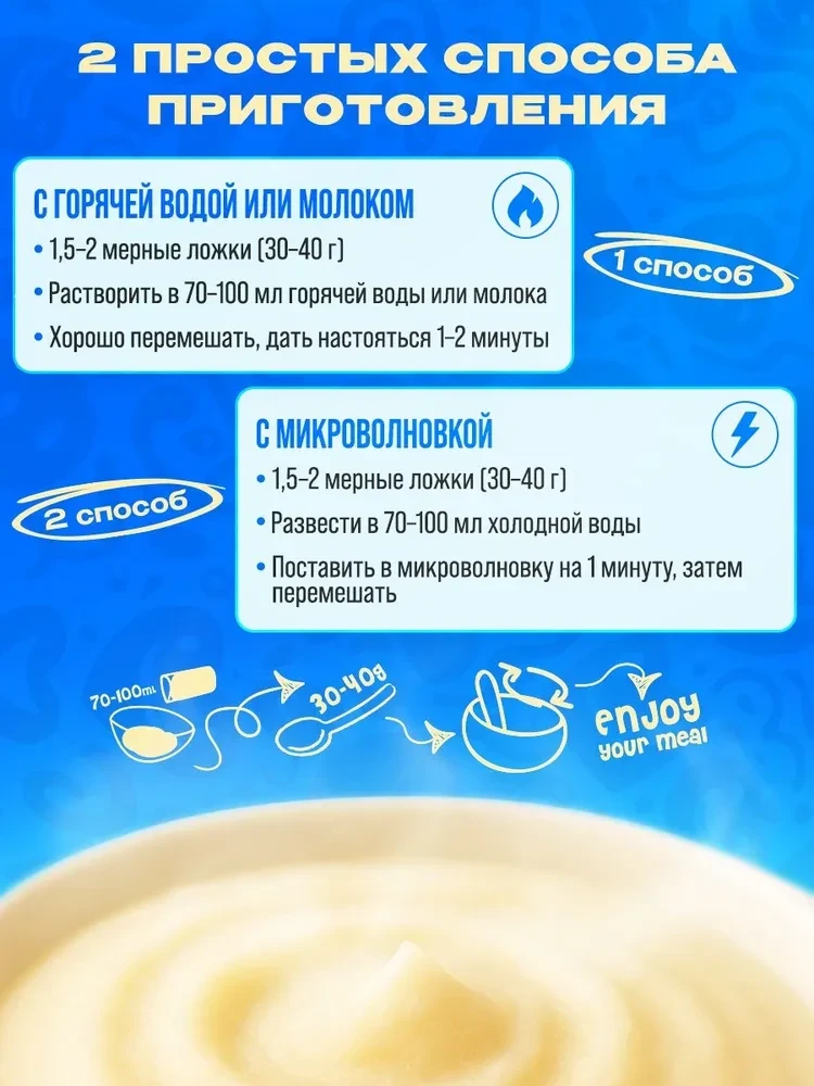 Смешайте порцию с горячей водой/молоком до состояния каши или крема.