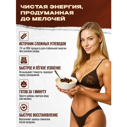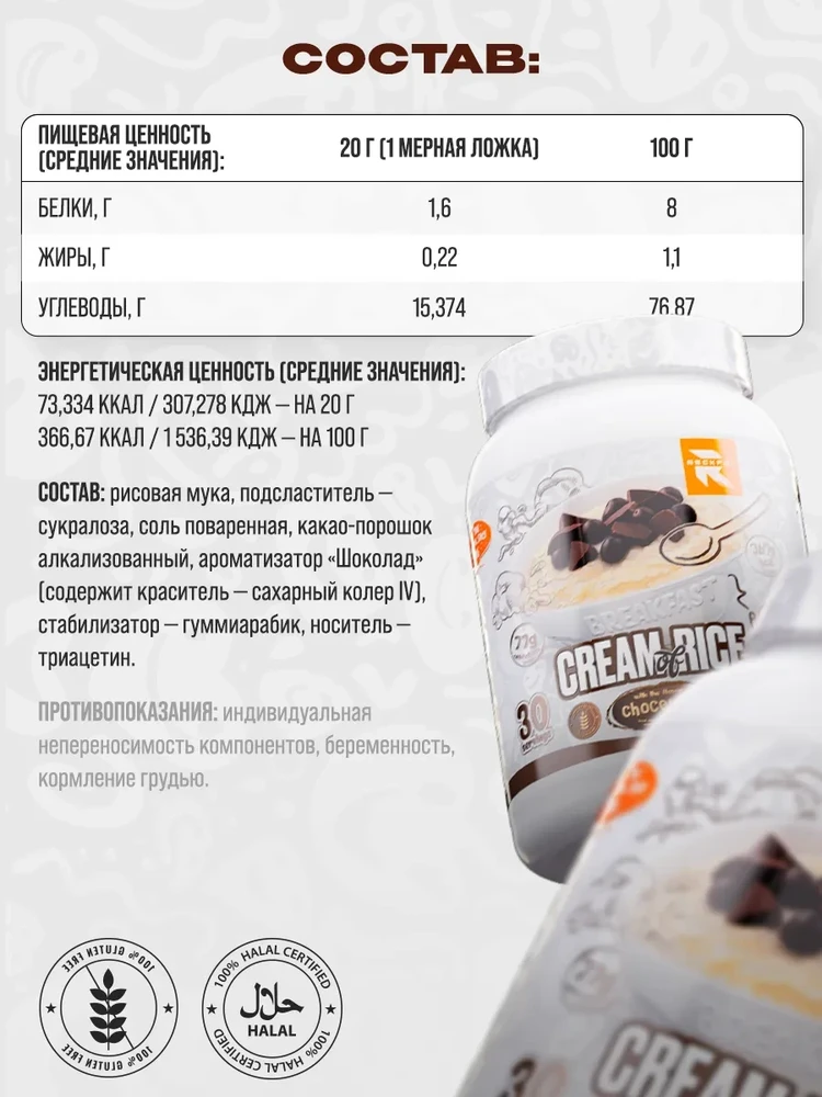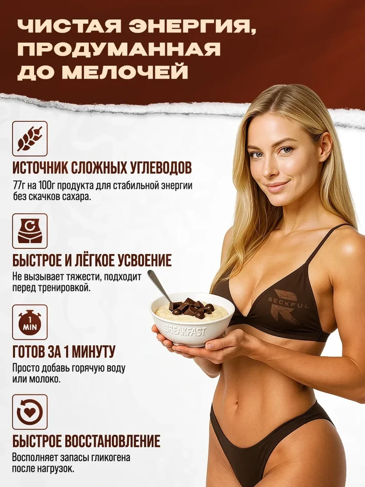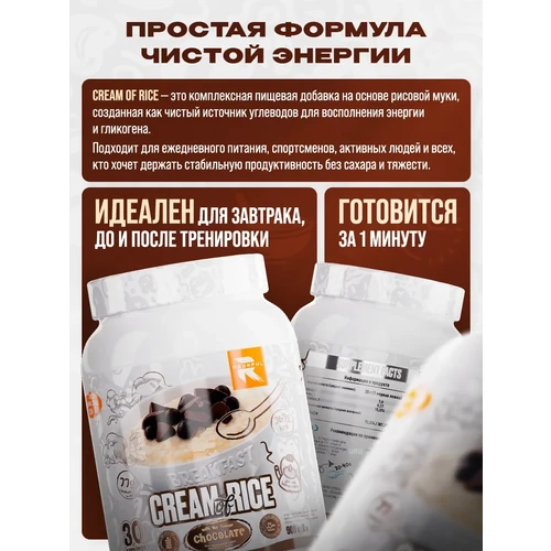 Reckful® Cream of Rice (Шоколадная) — это лёгкие углеводы в вкусном формате: помогает тренироваться мощнее, восстанавливаться быстрее и стабильно прогрессировать в массе.