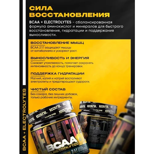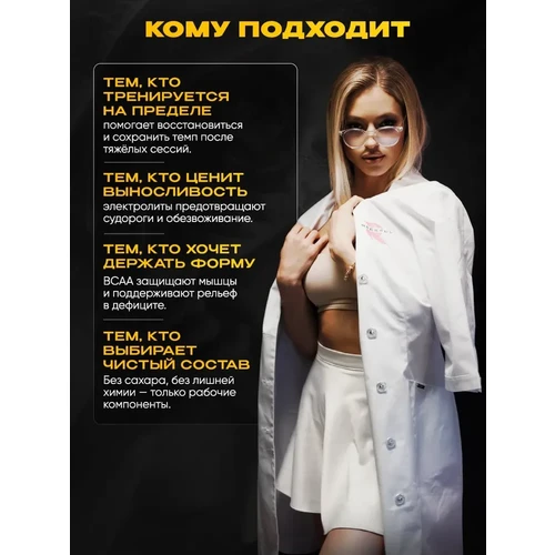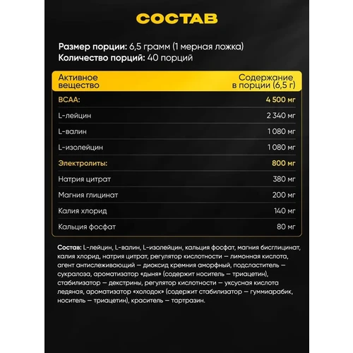 Состав (основные компоненты) BCAA: L-Лейцин, L-Изолейцин, L-Валин.Электролитный комплекс: Минералы для поддержки водно-солевого баланса.