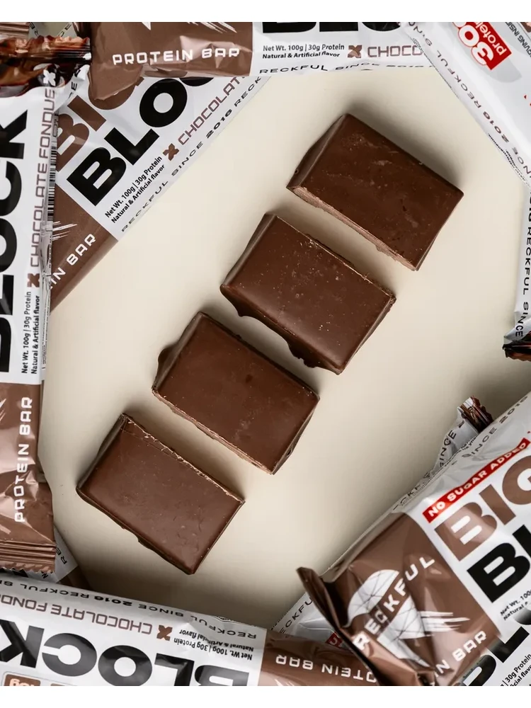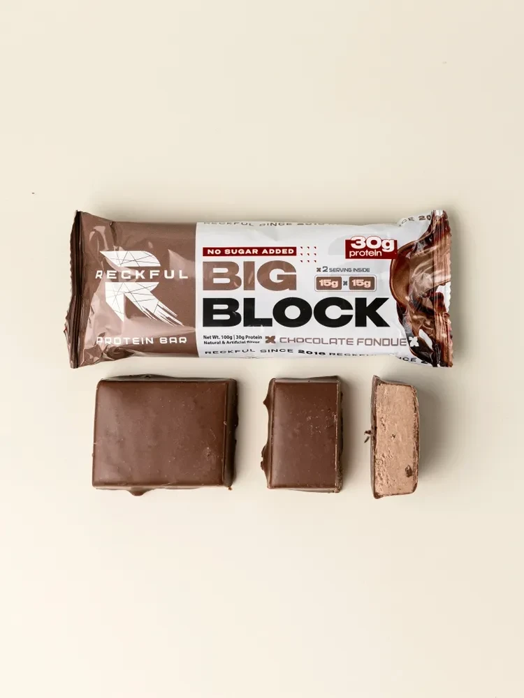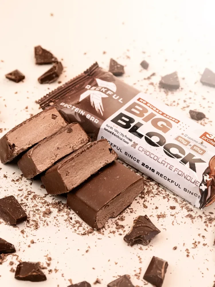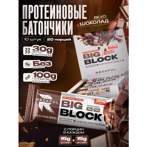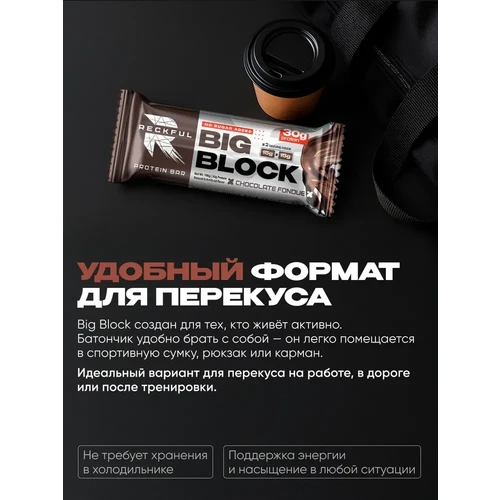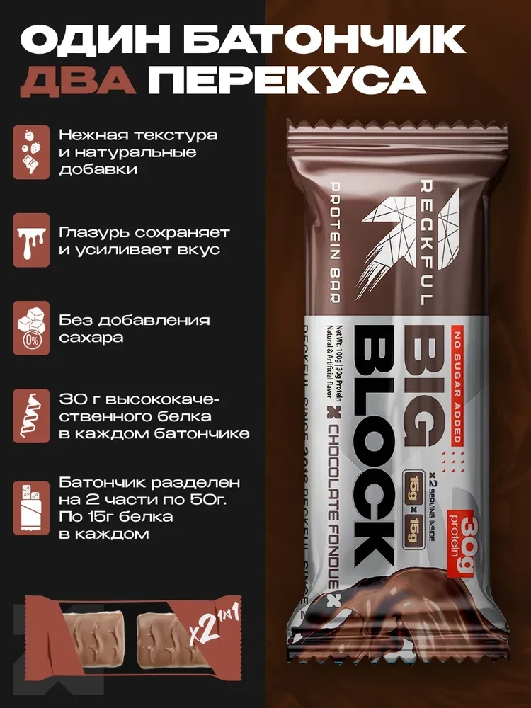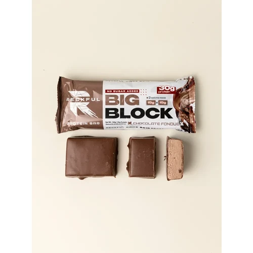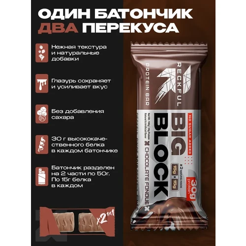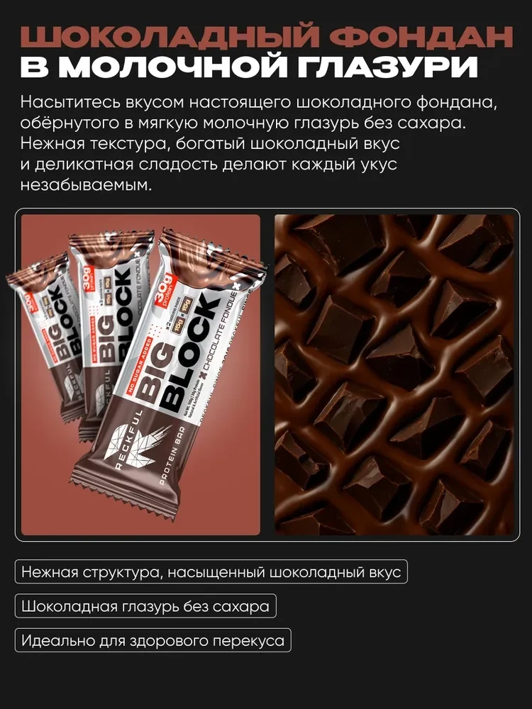 Батончик RECKFUL® PROTEIN BAR – BIG BLOCK 100g во вкусе "Шоколадный фондан в молочной глазури" предлагает насыщенный, густой шоколадный вкус, схожий с традиционным десертом, но без "пустых калорий" .