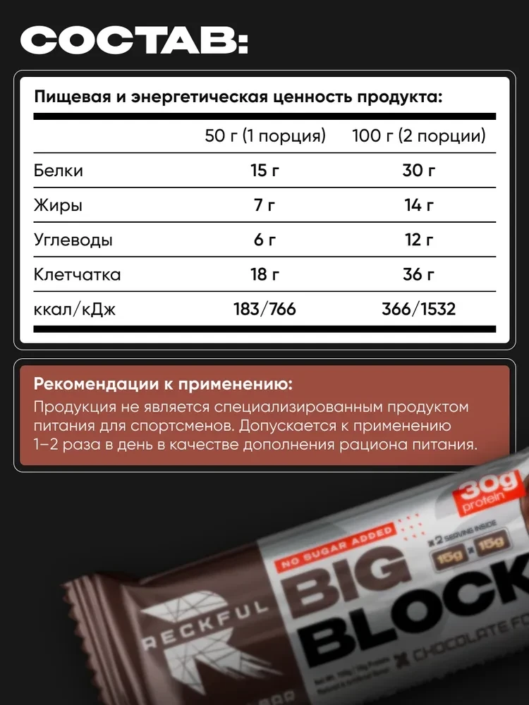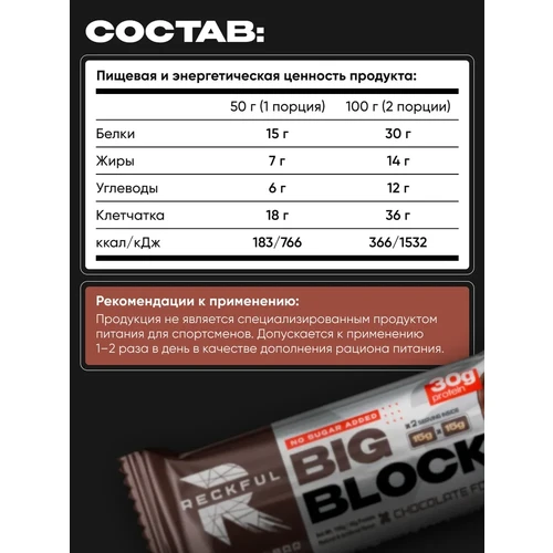 Формат BIG BLOCK: Вес 100 граммов и разделение на две порции по 50 граммов обеспечивают гибкость в использовании — можно съесть половинку до или после тренировки, или же использовать целый батончик как полноценный прием пищи или замену десерта.