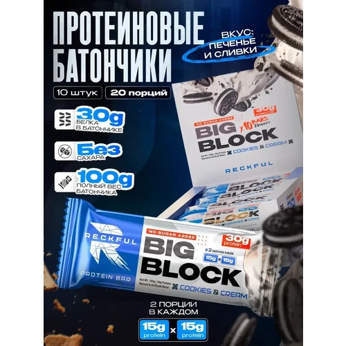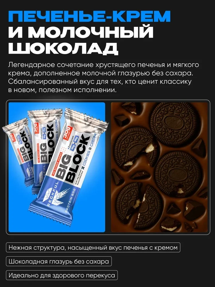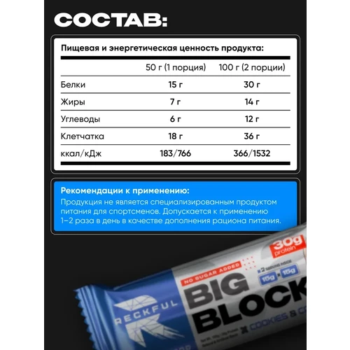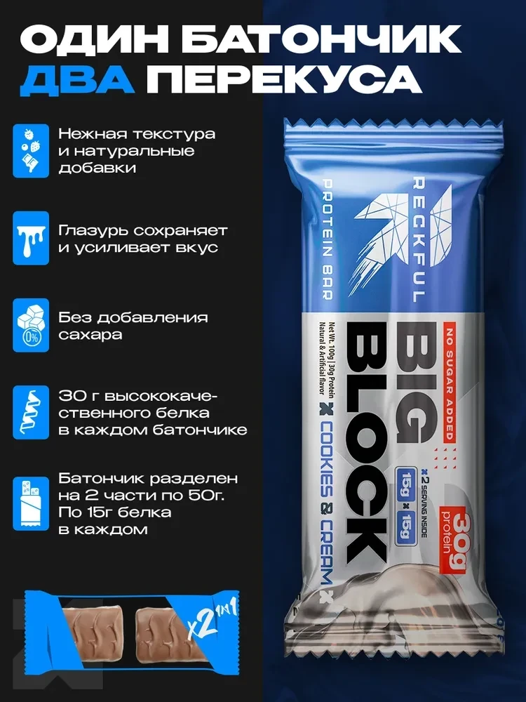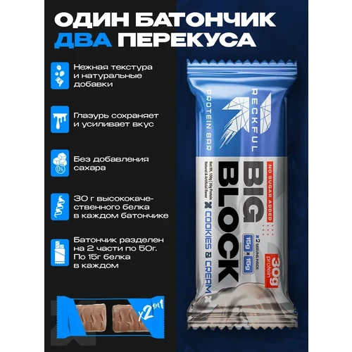 Протеиновый батончик RECKFUL® PROTEIN BAR – BIG BLOCK 100г — это не просто десерт, а полноценный элемент здорового рациона, обеспечивающий длительное чувство сытости и заряд энергии.