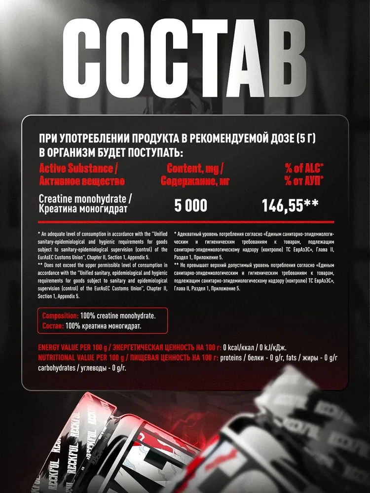 Состав: 100% моногидрат креатина (в версии без вкуса содержание чистого вещества составляет до 5000 мг на порцию).