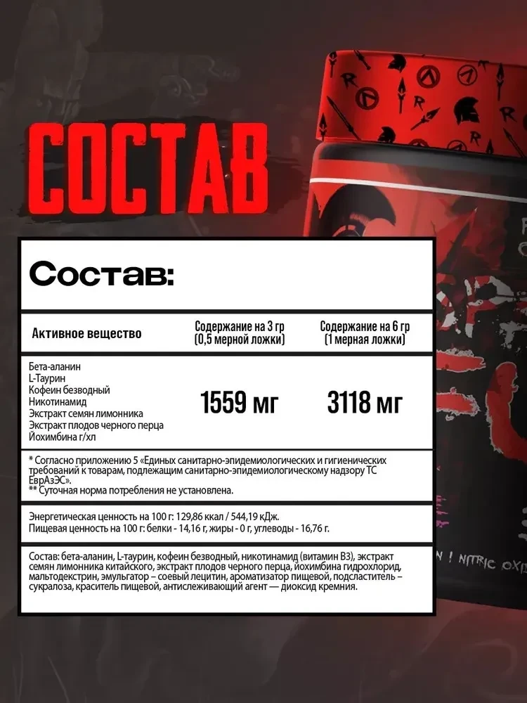 Активные компоненты: Бета-аланин: вызывает характерное покалывание кожи (парестезию) — признак начала действия продукта.Кофеин безводный: основной стимулятор энергии и внимания.