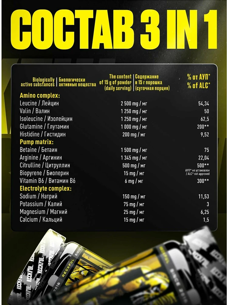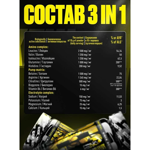 Состав на 1 порцию (15 г), по данным proteinstore.ru: Amino Complex + BCAA 2:1:1: L-Лейцин (2500 мг), L-Валин (1250 мг), L-Изолейцин (1250 мг), L-Глютамин (1000 мг), L-Гистидин (200 мг).Pump Matrix: Бетаин (1500 мг), L-Аргинина-кетоглуторат (AAKG) (1345 мг), L-Цитрулина DL-малат (500 мг), Биоперин (15 мг), Витамин B6 (6 мг).Electrolyte Complex: Натрия цитрат (150 мг), Калия цитрат (75 мг), Магния глицинат (25 мг), Кальция фосфат (15 мг).