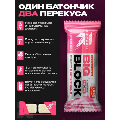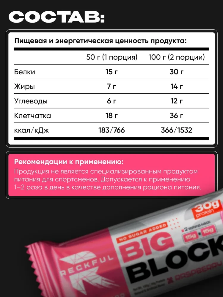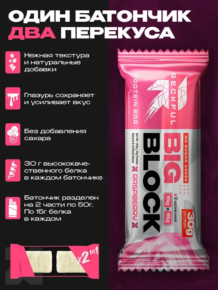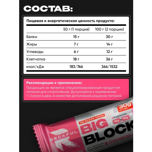 Батончик Reckful Big Block создан как функциональный инструмент для контроля аппетита и поддержания мышечной массы, а не просто как легкий перекус. Он разработан для активных людей, спортсменов и всех, кто придерживается диетического или здорового питания, исключающего сахар и пустые калории.