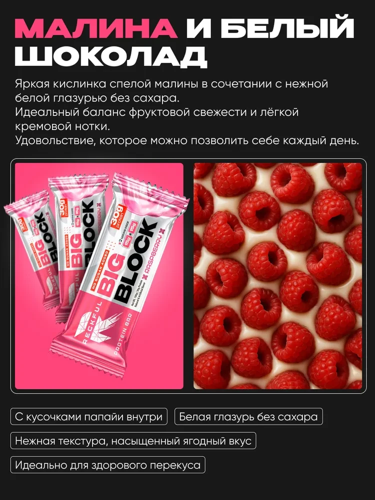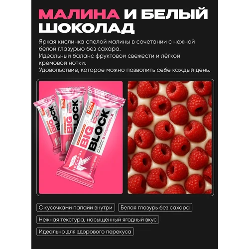 Вкус "Малина в белой глазури": Это яркий, сочный вкус, описываемый как "кисло-сладкая классика на новый лад". Белая глазурь дополняет малиновую начинку, создавая приятный десертный опыт без вреда для фигуры.