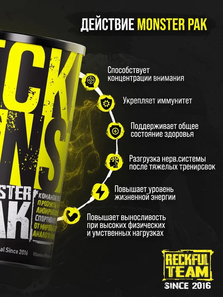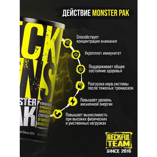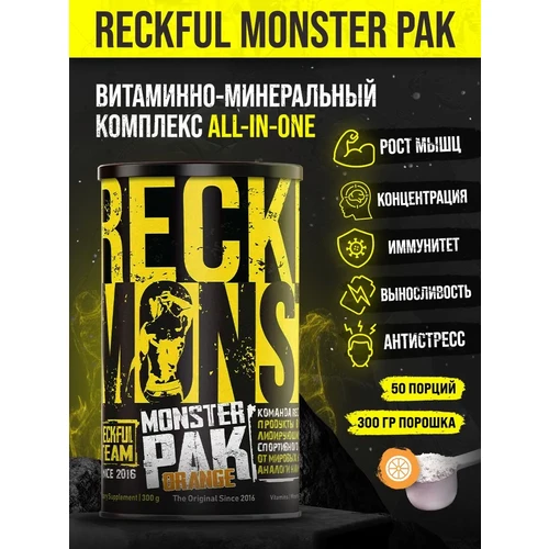 Reckful Monster Pak — это полноценное решение для тех, кто серьезно относится к своему здоровью и спортивным достижениям. Вместо того чтобы покупать и принимать множество отдельных добавок, этот продукт предлагает комплексный подход, объединяющий более 50 активных ингредиентов в одной удобной формуле.
